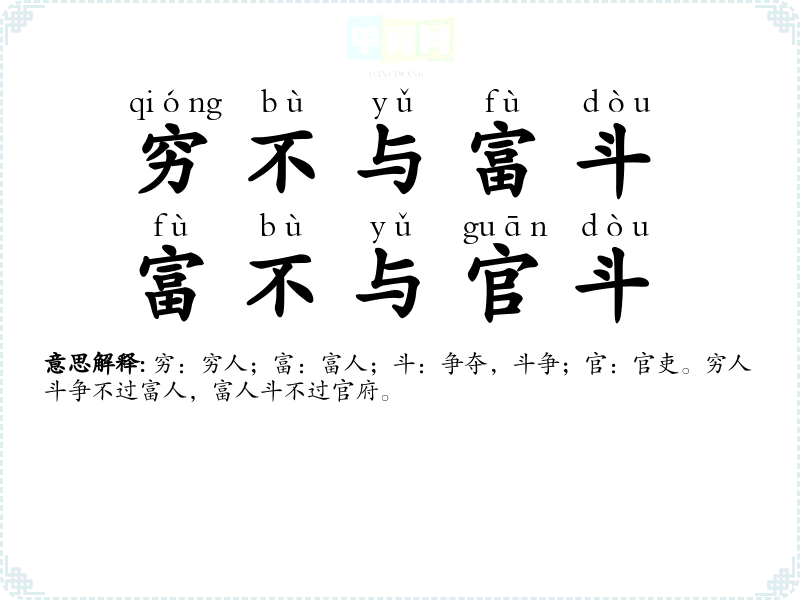 | 穷不与富斗,富不与官斗 | 穷:穷人;富:富人;斗:争夺,斗争;官:官吏。穷人斗争不过富人,富人斗不过官府。 |