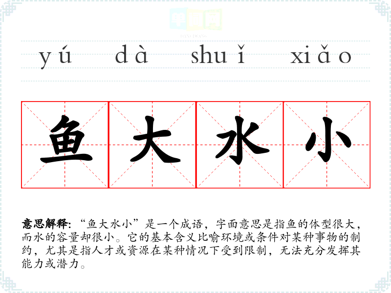 “鱼大水小”是一个成语,字面意思是指鱼的体型很大,而水的容量却很小。它的基本含义比喻环境或条件对某种事物的制约,尤其是指人才或资源在某种情况下受到限制,无法充分发挥其能力或潜力。