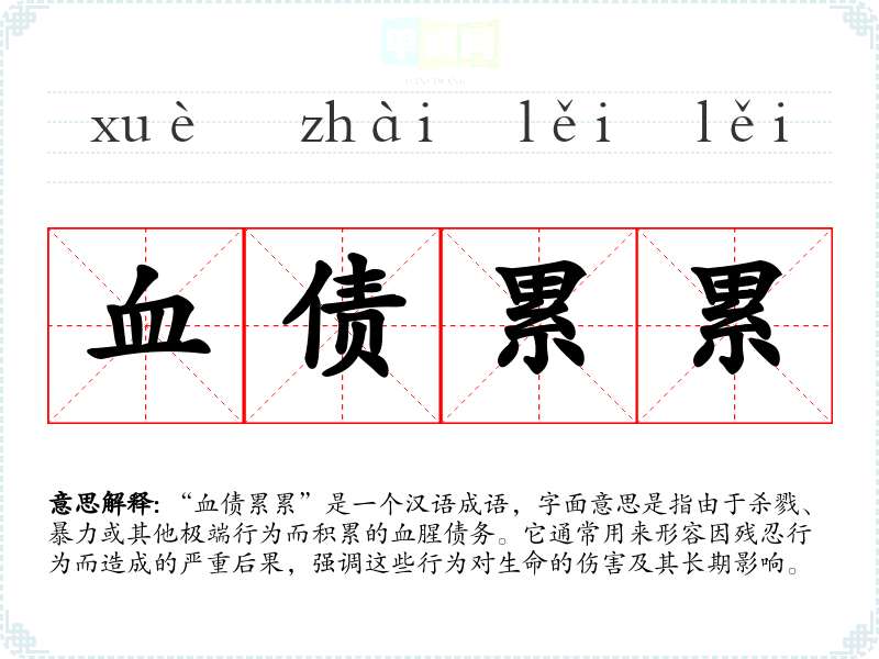 “血债累累”是一个汉语成语,字面意思是指由于杀戮、暴力或其他极端行为而积累的血腥债务。它通常用来形容因残忍行为而造成的严重后果,强调这些行为对生命的伤害及其长期影响。