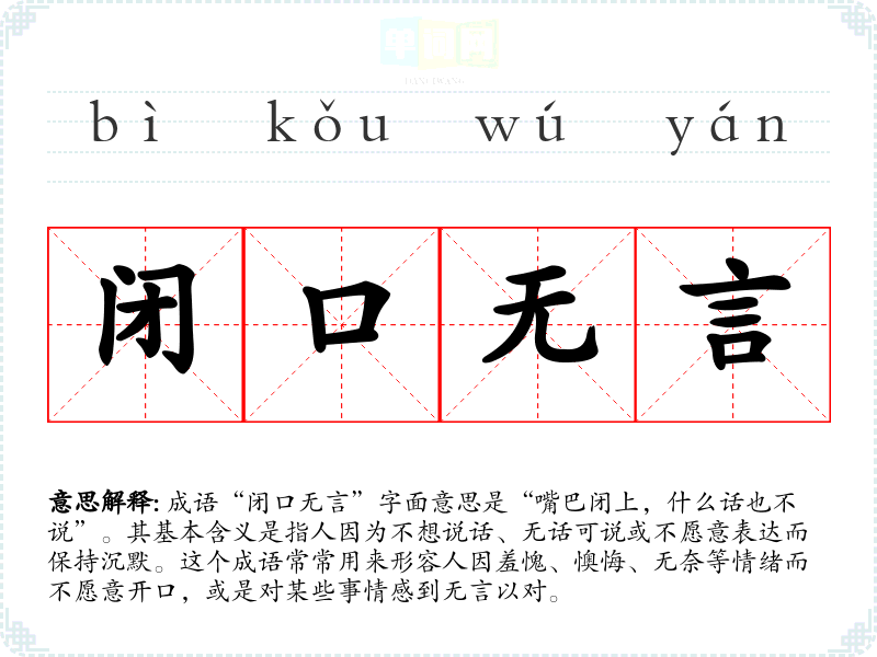 成语“闭口无言”字面意思是“嘴巴闭上,什么话也不说”。其基本含义是指人因为不想说话、无话可说或不愿意表达而保持沉默。这个成语常常用来形容人因羞愧、懊悔、无奈等情绪而不愿意开口,或是对某些事情感到无言以对。