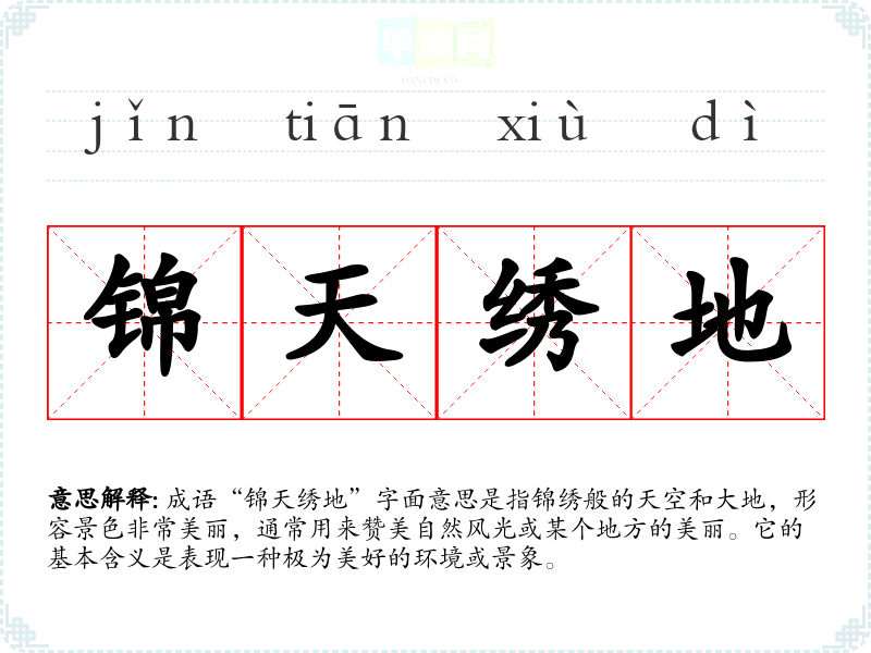 成语“锦天绣地”字面意思是指锦绣般的天空和大地,形容景色非常美丽,通常用来赞美自然风光或某个地方的美丽。它的基本含义是表现一种极为美好的环境或景象。