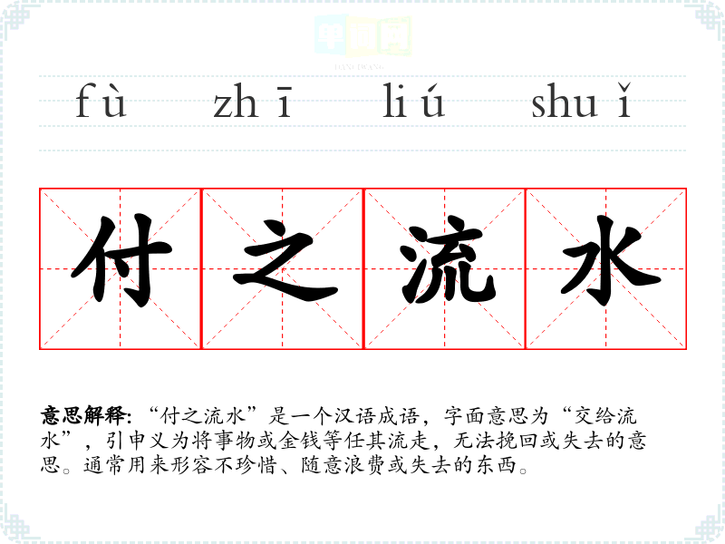 - “挥霍无度”:形容毫无节制地消费,和“付之流水”相似,强调浪费。