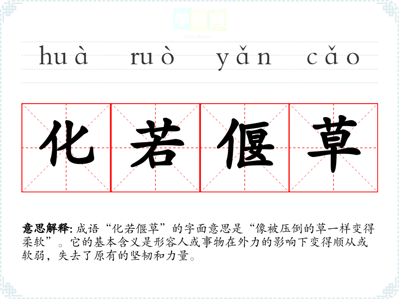 成语“化若偃草”的字面意思是“像被压倒的草一样变得柔软”。它的基本含义是形容人或事物在外力的影响下变得顺从或软弱,失去了原有的坚韧和力量。