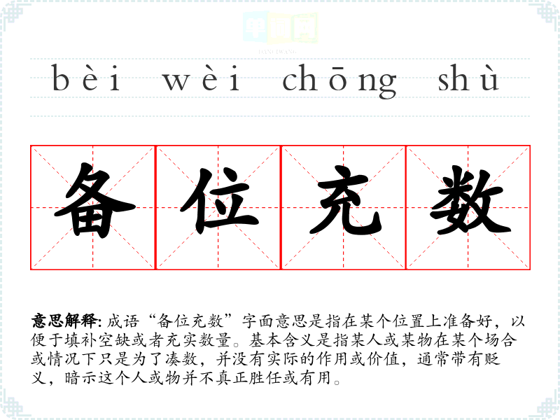 成语“备位充数”字面意思是指在某个位置上准备好,以便于填补空缺或者充实数量。基本含义是指某人或某物在某个场合或情况下只是为了凑数,并没有实际的作用或价值,通常带有贬义,暗示这个人或物并不真正胜任或有用。
