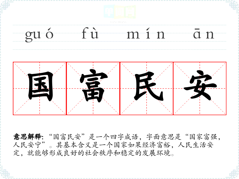 “国富民安”是一个四字成语,字面意思是“国家富强,人民安宁”。其基本含义是一个国家如果经济富裕,人民生活安定,就能够形成良好的社会秩序和稳定的发展环境。