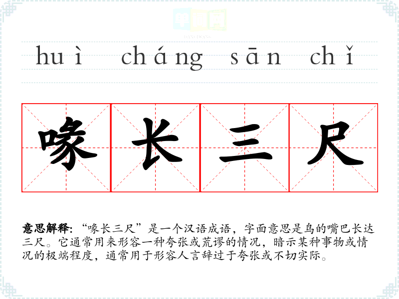 “喙长三尺”是一个汉语成语,字面意思是鸟的嘴巴长达三尺。它通常用来形容一种夸张或荒谬的情况,暗示某种事物或情况的极端程度,通常用于形容人言辞过于夸张或不切实际。