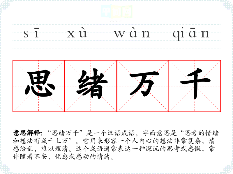 “思绪万千”是一个汉语成语,字面意思是“思考的情绪和想法有成千上万”。它用来形容一个人内心的想法非常复杂,情感纷乱,难以理清。这个成语通常表达一种深沉的思考或感慨,常伴随着不安、忧虑或感动的情绪。