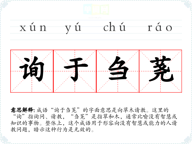 成语“询于刍荛”的字面意思是向草木请教。这里的“询”指询问、请教,“刍荛”是指草和木,通常比喻没有智慧或知识的事物。整体上,这个成语用于形容向没有智慧或能力的人请教问题,暗示这种行为是无效的。