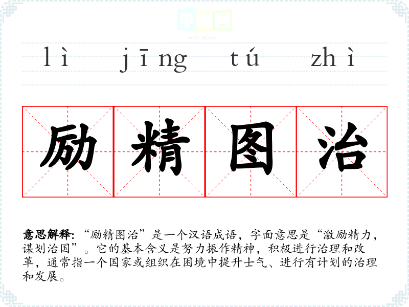 | 厉精图治 | 厉:振作,振奋;图:设法,谋求;治:治理国家。振奋精神,想办法治理好国家 |