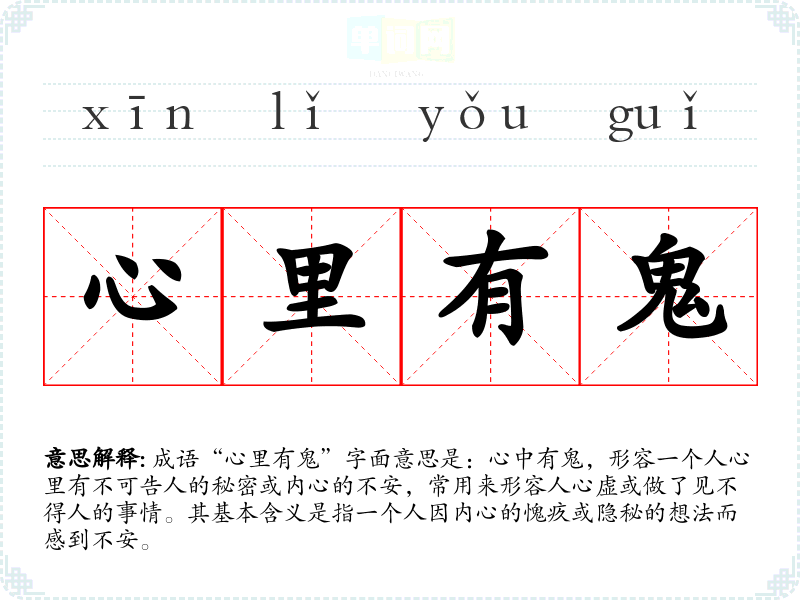 成语“心里有鬼”字面意思是:心中有鬼,形容一个人心里有不可告人的秘密或内心的不安,常用来形容人心虚或做了见不得人的事情。其基本含义是指一个人因内心的愧疚或隐秘的想法而感到不安。