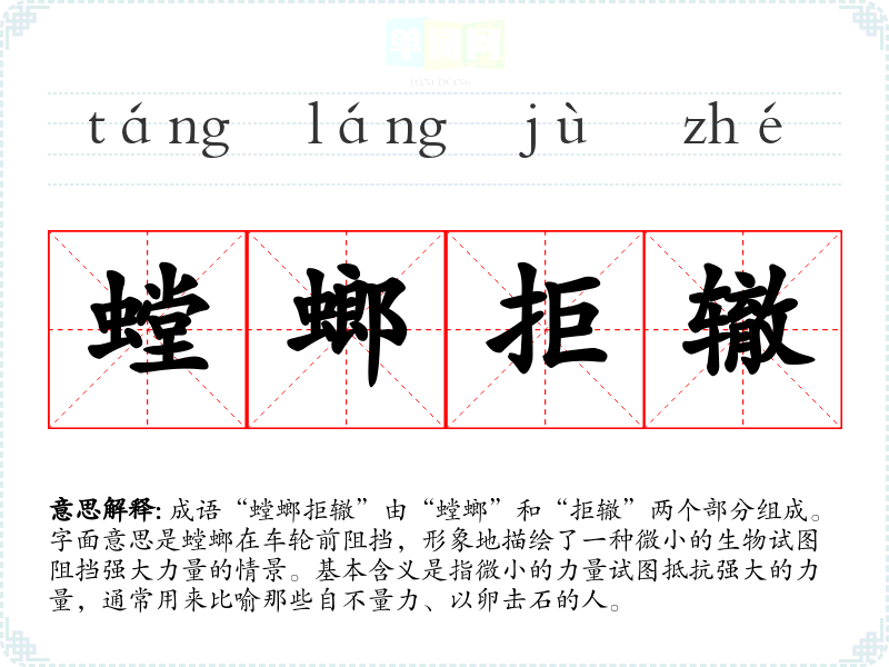 - 日常对话:朋友之间讨论某人过于自信地挑战不可能的事情时,可以用“螳螂拒辙”来形象地说明。