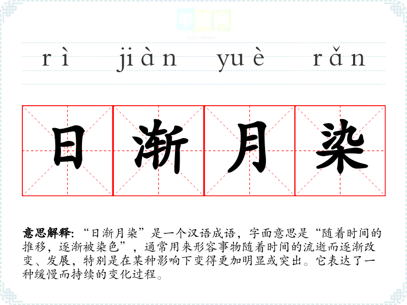 “日渐月染”并没有特别明确的历史来源,但它的构成可以看作是对自然现象的观察与总结。在古代文学中,类似的表达常用于描写时间的流逝、自然的变化和人事的演变,体现了**古代哲学中对时间和变化的思考。