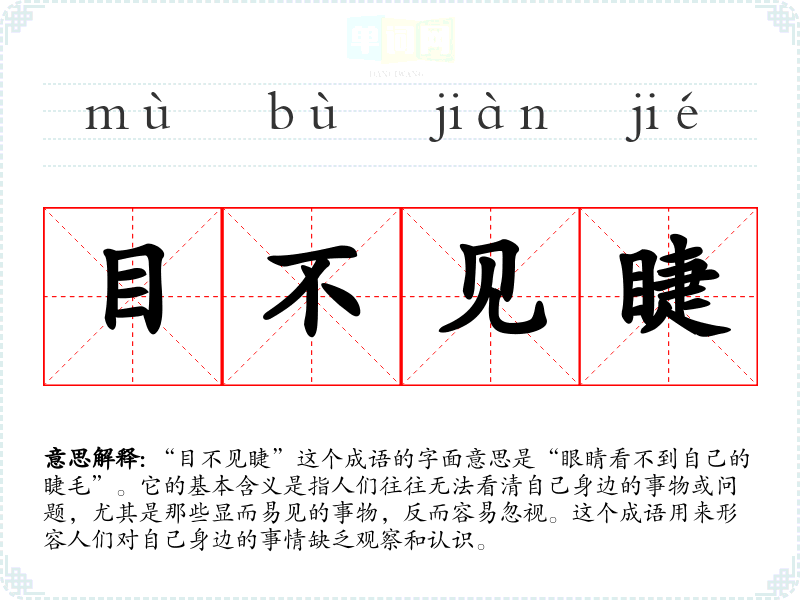 “目不见睫”这个成语的字面意思是“眼睛看不到自己的睫毛”。它的基本含义是指人们往往无法看清自己身边的事物或问题,尤其是那些显而易见的事物,反而容易忽视。这个成语用来形容人们对自己身边的事情缺乏观察和认识。