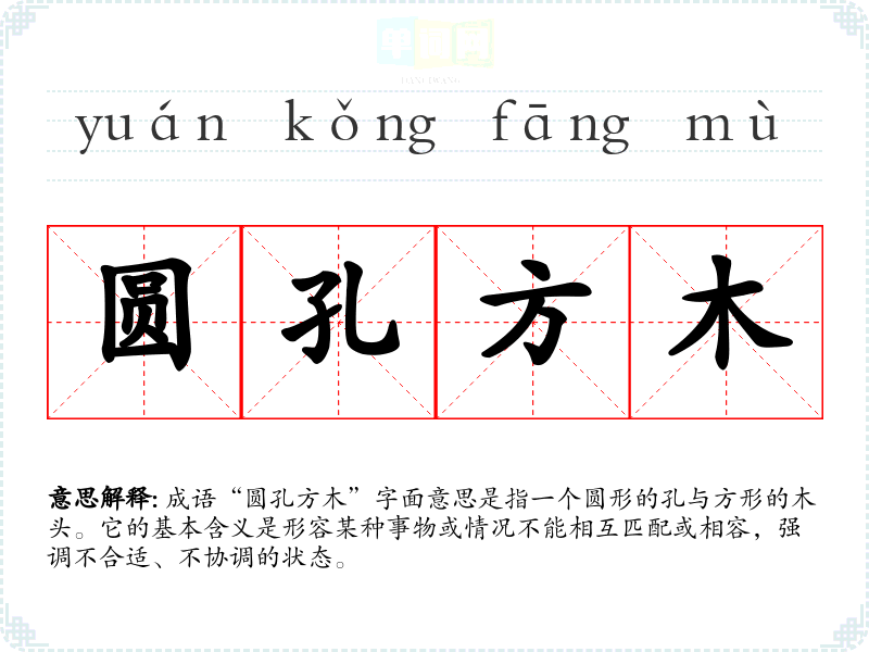 成语“圆孔方木”字面意思是指一个圆形的孔与方形的木头。它的基本含义是形容某种事物或情况不能相互匹配或相容,强调不合适、不协调的状态。