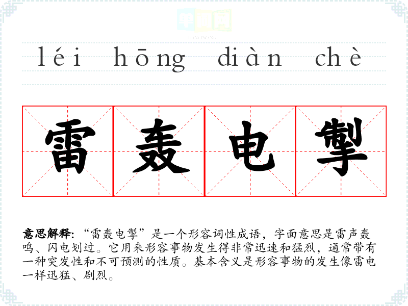 “雷轰电掣”是一个形容词性成语,字面意思是雷声轰鸣、闪电划过。它用来形容事物发生得非常迅速和猛烈,通常带有一种突发性和不可预测的性质。基本含义是形容事物的发生像雷电一样迅猛、剧烈。