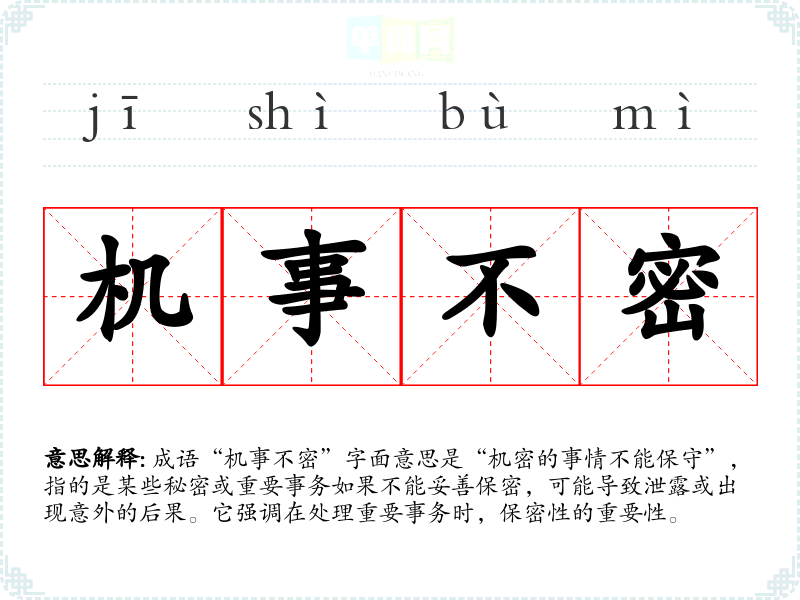 成语“机事不密”字面意思是“机密的事情不能保守”,指的是某些秘密或重要事务如果不能妥善保密,可能导致泄露或出现意外的后果。它强调在处理重要事务时,保密性的重要性。