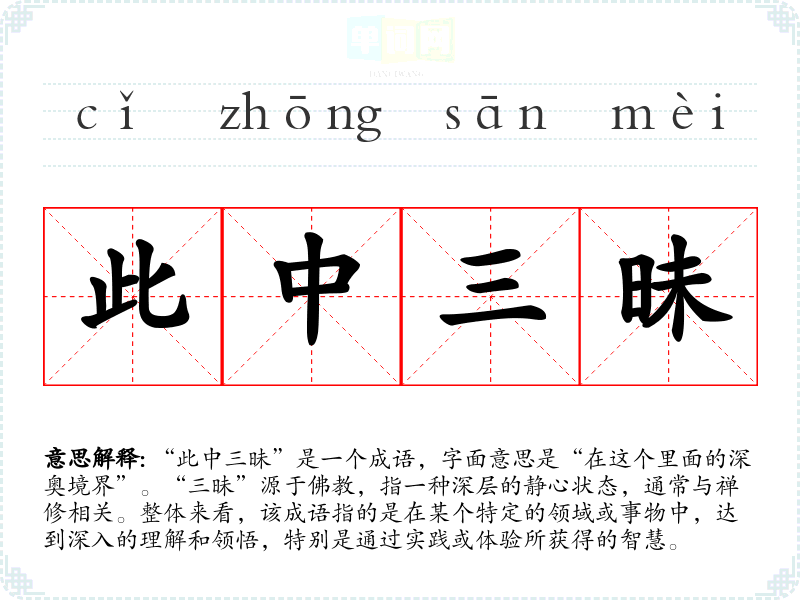 | 此中三昧 | 三昧:佛教用语,梵文音译词,意思是“正定”,即屏绝杂念,使心神平静,是佛门修养之法。比喻这里面的奥妙之处。 |