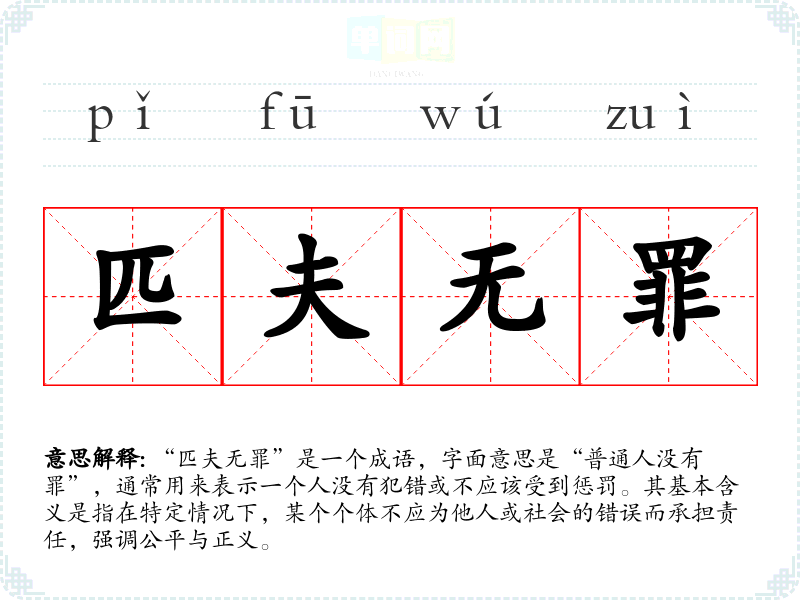 “匹夫无罪”是一个成语,字面意思是“普通人没有罪”,通常用来表示一个人没有犯错或不应该受到惩罚。其基本含义是指在特定情况下,某个个体不应为他人或社会的错误而承担责任,强调公平与正义。