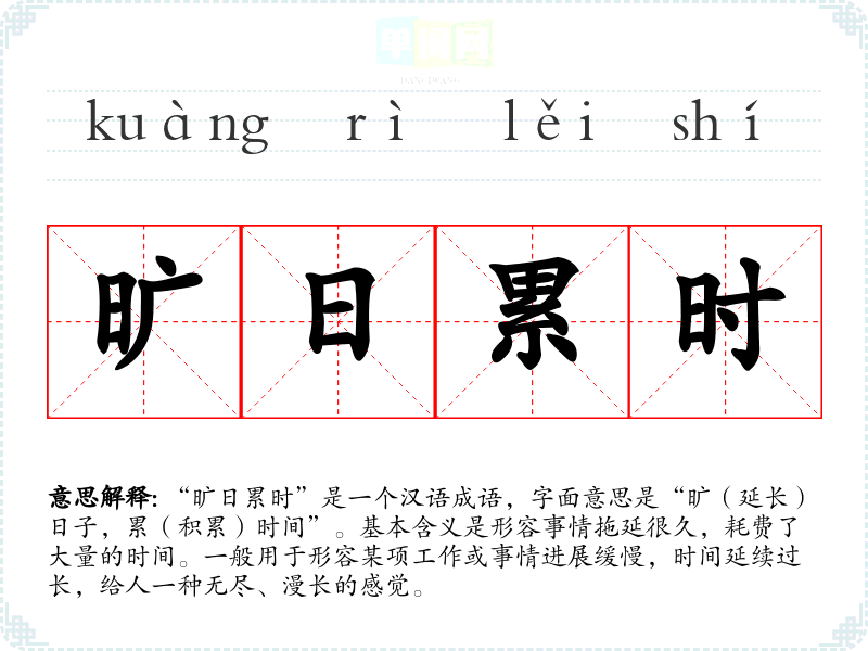 “旷日累时”是一个汉语成语,字面意思是“旷(延长)日子,累(积累)时间”。基本含义是形容事情拖延很久,耗费了大量的时间。一般用于形容某项工作或事情进展缓慢,时间延续过长,给人一种无尽、漫长的感觉。