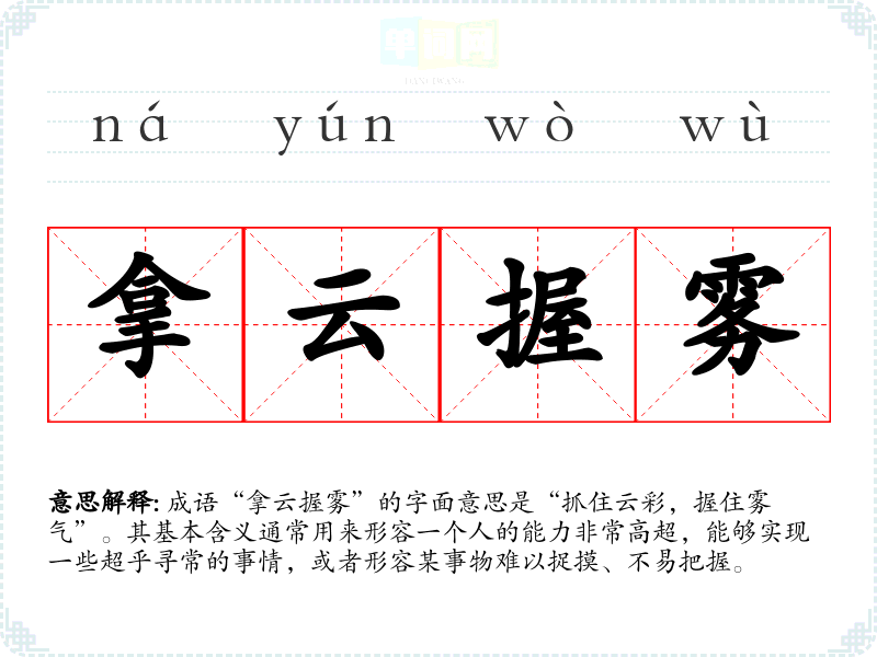 成语“拿云握雾”的字面意思是“抓住云彩,握住雾气”。其基本含义通常用来形容一个人的能力非常高超,能够实现一些超乎寻常的事情,或者形容某事物难以捉摸、不易把握。