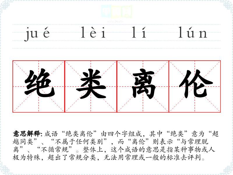 成语“绝类离伦”由四个字组成,其中“绝类”意为“超越同类”、“不属于任何类别”,而“离伦”则表示“与常理脱离”、“不循常规”。整体上,这个成语的意思是指某种事物或人极为特殊,超出了常规分类,无法用常理或一般的标准去评判。