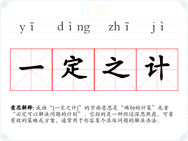 成语“[一定之计]”的字面意思是“确切的计策”或者“必定可以解决问题的计划”。它指的是一种经过深思熟虑、可靠有效的策略或方案,通常用于形容某个具体问题的解决办法。