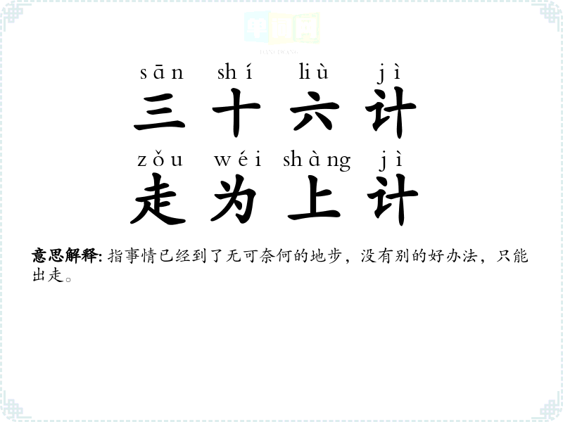 | 三十六策,走是上计 | 指事情已经到了无可奈何的地步,没有别的好办法,只能出走了事。 |