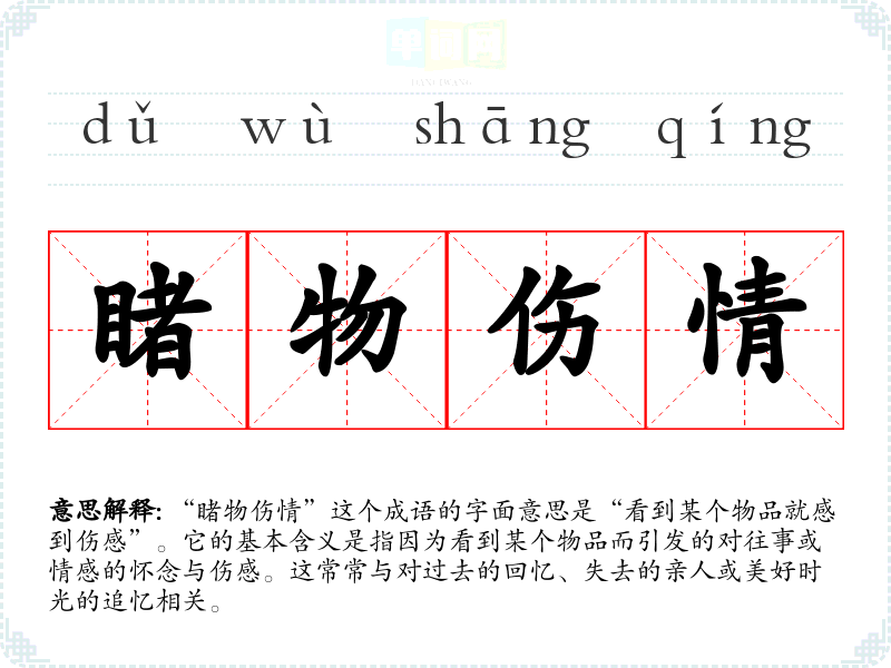 “睹物伤情”这个成语的字面意思是“看到某个物品就感到伤感”。它的基本含义是指因为看到某个物品而引发的对往事或情感的怀念与伤感。这常常与对过去的回忆、失去的亲人或美好时光的追忆相关。