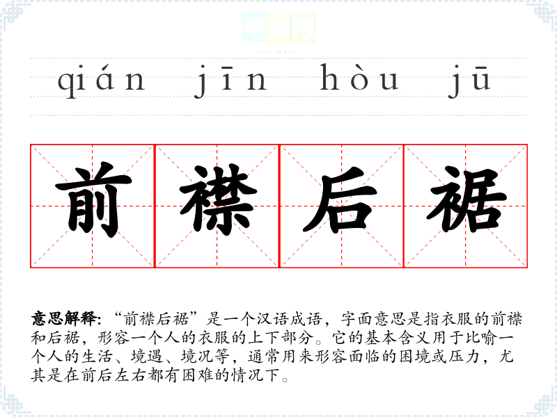 “前襟后裾”是一个汉语成语,字面意思是指衣服的前襟和后裾,形容一个人的衣服的上下部分。它的基本含义用于比喻一个人的生活、境遇、境况等,通常用来形容面临的困境或压力,尤其是在前后左右都有困难的情况下。