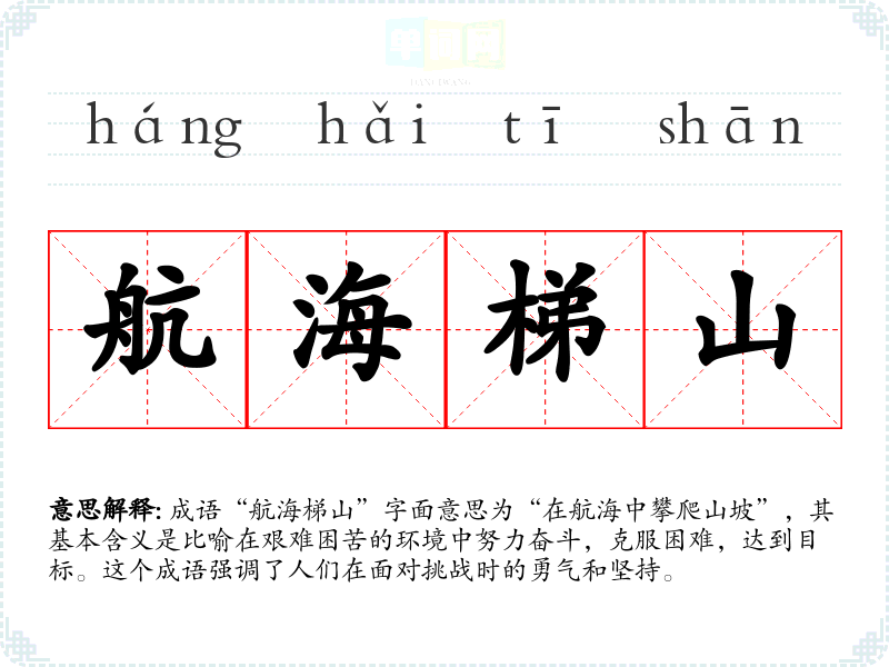 成语“航海梯山”字面意思为“在航海中攀爬山坡”,其基本含义是比喻在艰难困苦的环境中努力奋斗,克服困难,达到目标。这个成语强调了人们在面对挑战时的勇气和坚持。