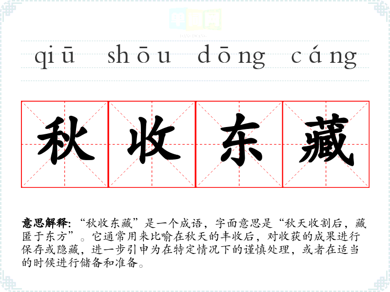 “秋收东藏”是一个成语,字面意思是“秋天收割后,藏匿于东方”。它通常用来比喻在秋天的丰收后,对收获的成果进行保存或隐藏,进一步引申为在特定情况下的谨慎处理,或者在适当的时候进行储备和准备。