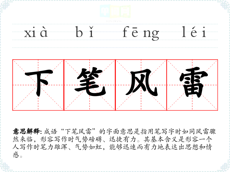成语“下笔风雷”的字面意思是指用笔写字时如同风雷骤然来临,形容写作时气势磅礴、迅捷有力。其基本含义是形容一个人写作时笔力雄浑、气势如虹,能够迅速而有力地表达出思想和情感。