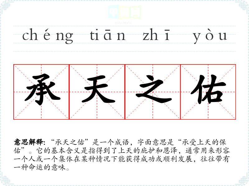 | 承天之祐 | 承:受;祐:保佑。蒙受老天的保祐。 |