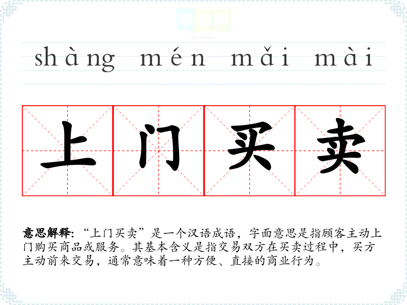 “上门买卖”是一个汉语成语,字面意思是指顾客主动上门购买商品或服务。其基本含义是指交易双方在买卖过程中,买方主动前来交易,通常意味着一种方便、直接的商业行为。