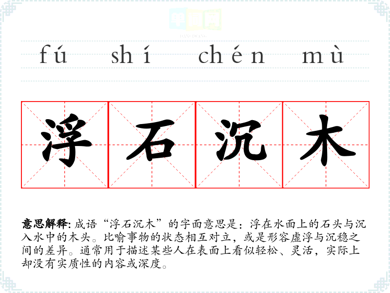 在我的日常生活中,我常常会用“浮石沉木”来评价一些事物。例如,在参加某些活动时,看到一些表面热闹但内在空洞的现象,就会用这个成语来形容。这样不仅帮助我更清晰地表达自己的看法,也让我在思考时更加注重事物的本质。