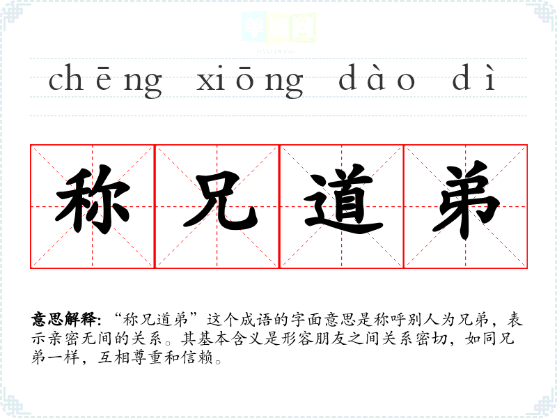 “称兄道弟”这个成语的字面意思是称呼别人为兄弟,表示亲密无间的关系。其基本含义是形容朋友之间关系密切,如同兄弟一样,互相尊重和信赖。