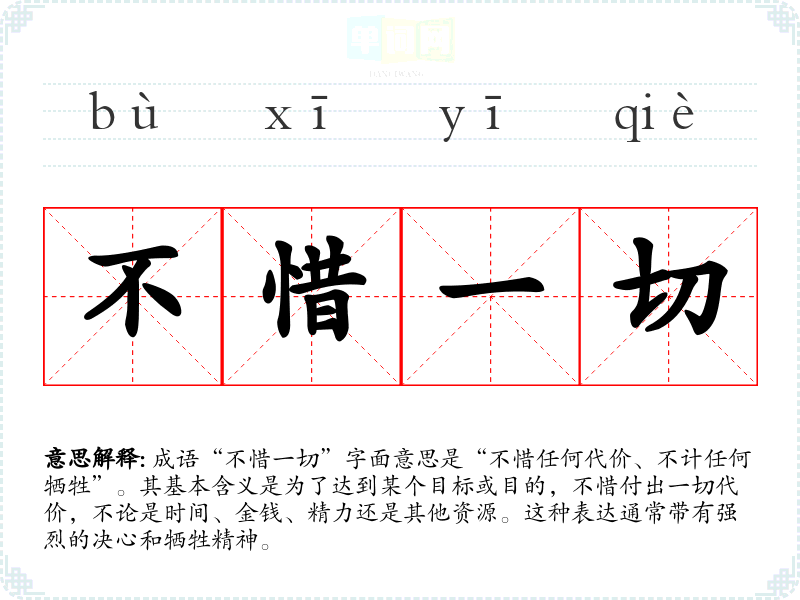 成语“不惜一切”字面意思是“不惜任何代价、不计任何牺牲”。其基本含义是为了达到某个目标或目的,不惜付出一切代价,不论是时间、金钱、精力还是其他资源。这种表达通常带有强烈的决心和牺牲精神。