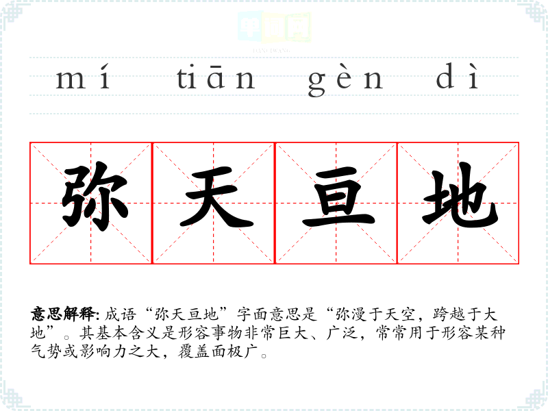 成语“弥天亘地”字面意思是“弥漫于天空,跨越于大地”。其基本含义是形容事物非常巨大、广泛,常常用于形容某种气势或影响力之大,覆盖面极广。