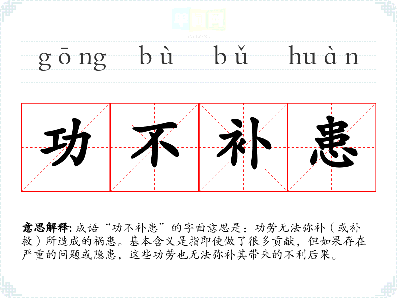 成语“功不补患”的字面意思是:功劳无法弥补(或补救)所造成的祸患。基本含义是指即使做了很多贡献,但如果存在严重的问题或隐患,这些功劳也无法弥补其带来的不利后果。