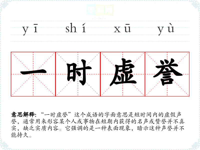 | 一时虚誉 | 虚:表面的、不实在的;誉:声誉。暂时的、表面的荣誉。 |
