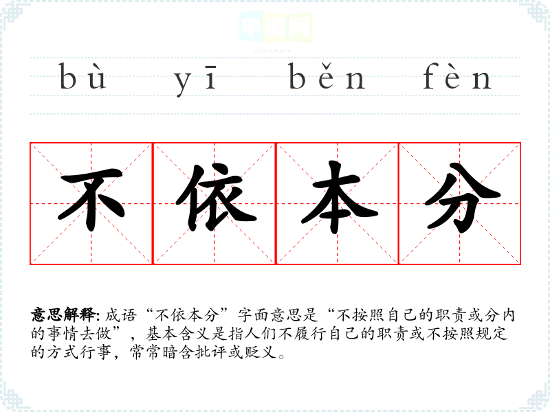 成语“不依本分”字面意思是“不按照自己的职责或分内的事情去做”,基本含义是指人们不履行自己的职责或不按照规定的方式行事,常常暗含批评或贬义。