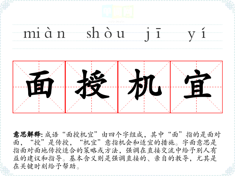 成语“面授机宜”由四个字组成,其中“面”指的是面对面,“授”是传授,“机宜”意指机会和适宜的措施。字面意思是指面对面地传授适合的策略或方法,强调在直接交流中给予别人有益的建议和指导。基本含义则是强调直接的、亲自的教导,尤其是在关键时刻给予帮助。