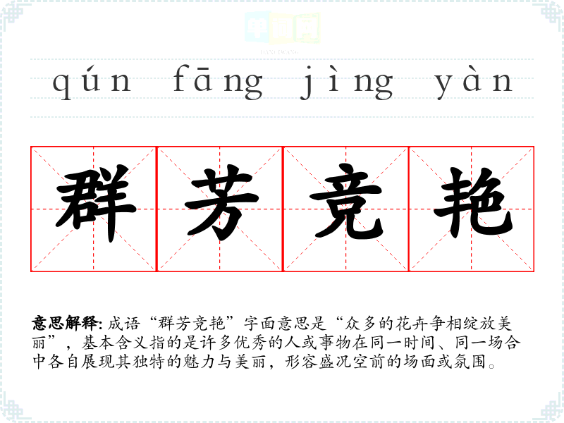 成语“群芳竞艳”字面意思是“众多的花卉争相绽放美丽”,基本含义指的是许多优秀的人或事物在同一时间、同一场合中各自展现其独特的魅力与美丽,形容盛况空前的场面或氛围。