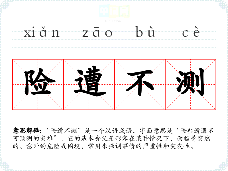 该成语的确切来源虽然没有明确的文献记载,但其构成的词汇在古代文献中就有所使用。其中,“险”表示危险、艰险,“遭”表示遭遇,“不测”则指意外发生的事情。该成语旨在传达突发性**带来的威胁感,反映了古人对不可控因素的深刻认识。