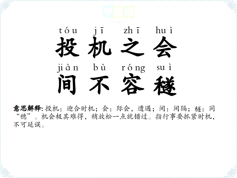 | 投机之会,间不容穟 | 投机:迎合时机;会:际会,遭遇;间:间隔;穟:同“穗”。机会极其难得,稍放松一点就错过。指行事要抓紧时机,不可延误。 |