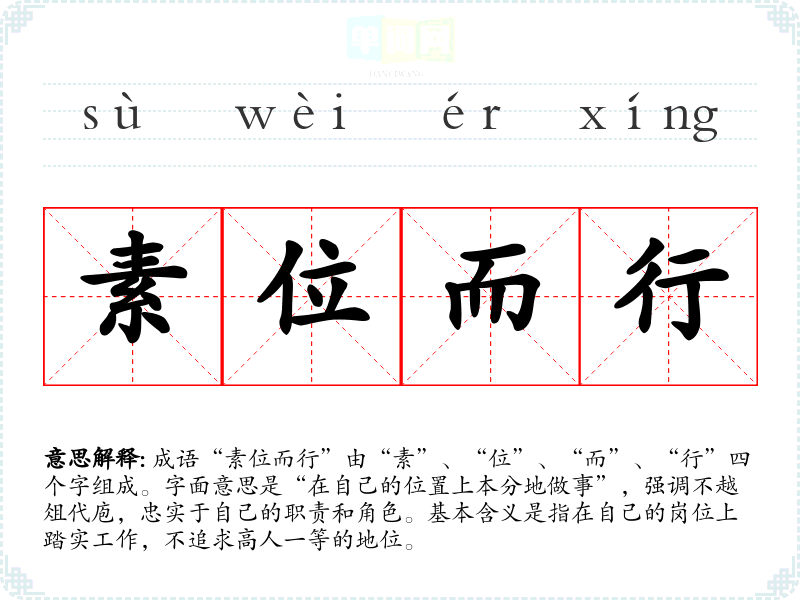 成语“素位而行”由“素”、“位”、“而”、“行”四个字组成。字面意思是“在自己的位置上本分地做事”,强调不越俎代庖,忠实于自己的职责和角色。基本含义是指在自己的岗位上踏实工作,不追求高人一等的地位。