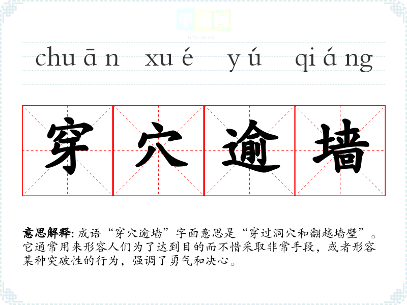 成语“穿穴逾墙”字面意思是“穿过洞穴和翻越墙壁”。它通常用来形容人们为了达到目的而不惜采取非常手段,或者形容某种突破性的行为,强调了勇气和决心。