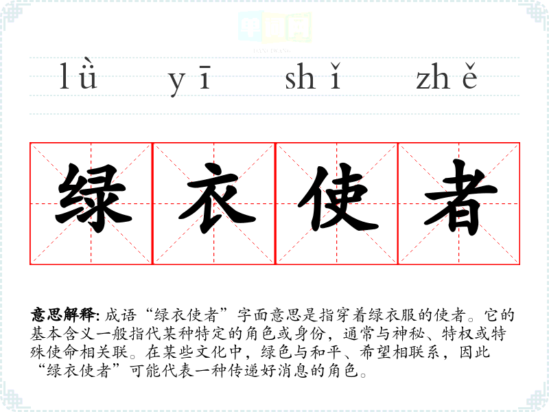 成语“绿衣使者”字面意思是指穿着绿衣服的使者。它的基本含义一般指代某种特定的角色或身份,通常与神秘、特权或特殊使命相关联。在某些文化中,绿色与和平、希望相联系,因此“绿衣使者”可能代表一种传递好消息的角色。