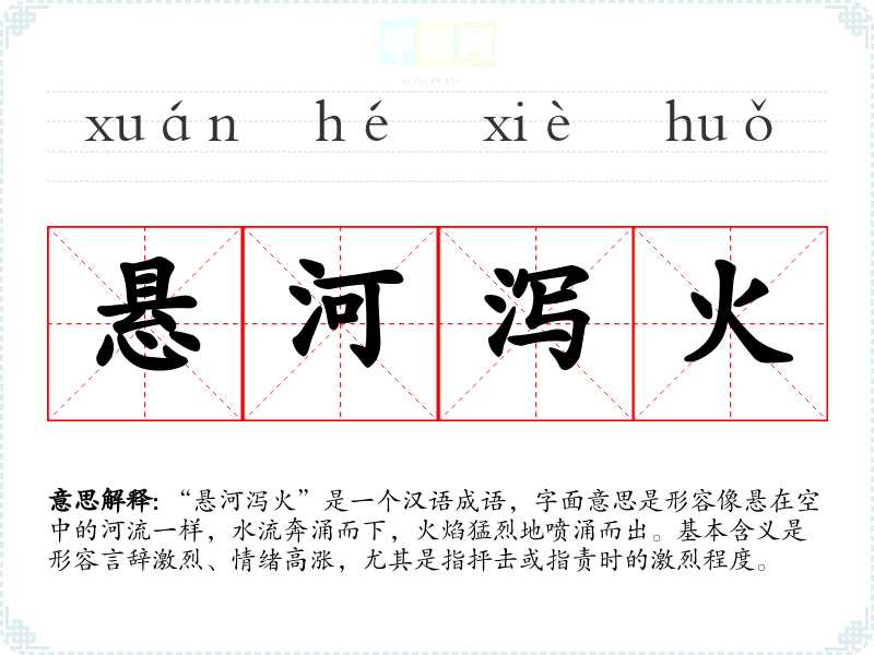 通过对“悬河泻火”的学,我深刻体会到语言的力量和情感的表达在交流中的重要性。这个成语不仅丰富了我的词汇,也为我在语言学和表达中增添了更多的表现力,让我在各种场合中能够更好地传达自己的情感和观点。