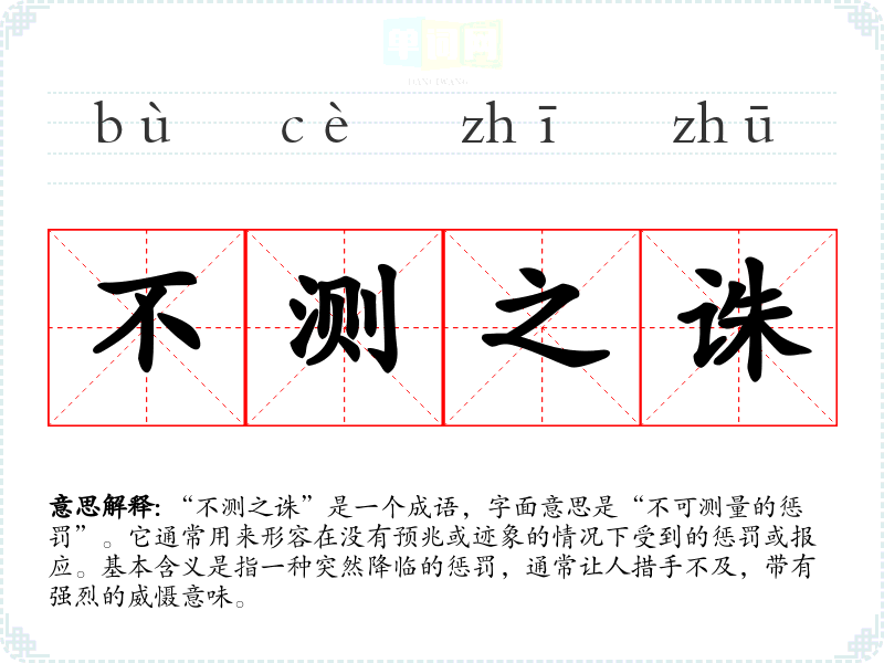 “不测之诛”是一个成语,字面意思是“不可测量的惩罚”。它通常用来形容在没有预兆或迹象的情况下受到的惩罚或报应。基本含义是指一种突然降临的惩罚,通常让人措手不及,带有强烈的威慑意味。